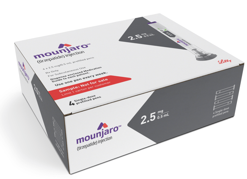 Eli Lilly and Co.Mounjaro SamplesMounjaro (tirzepatide) injection for subcutaneous use. GLP-1 receptor agonist and GIP receptor agonist. 4 pens (28-day supply). REFRIGERATED PRODUCT - Keep between 36°F-46°F (2°C-8°C). Do not freeze. Protect from light.